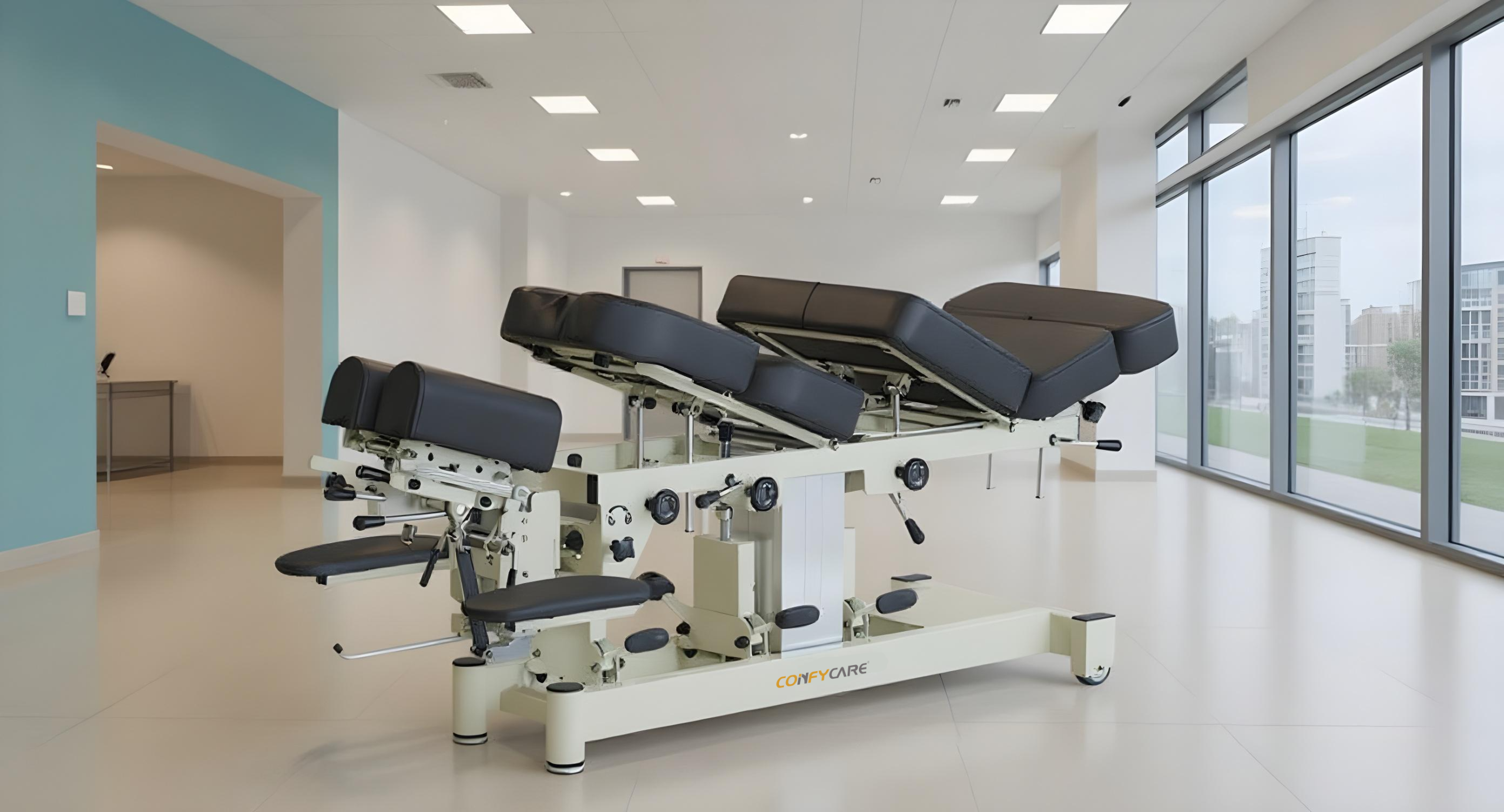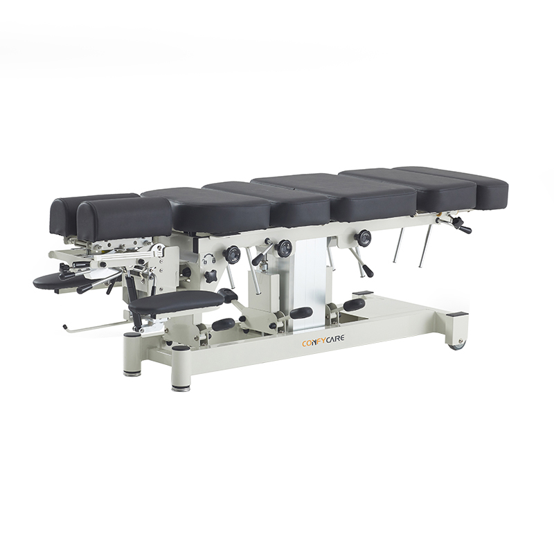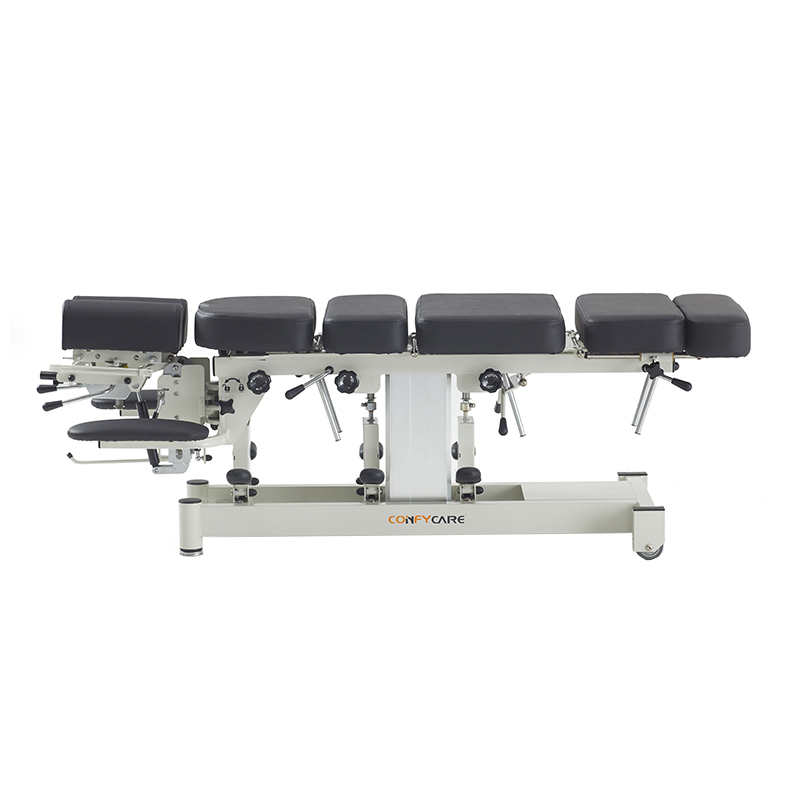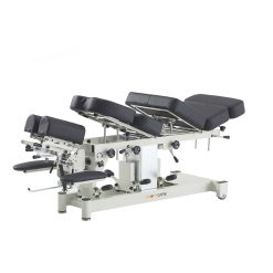 Κρεβάτι χειροπρακτικής θεραπείας με επτά τμήματα υποστήριξης και ηλεκτρική ρύθμιση ύψους μέσω ποδοδιακόπτη. Διαθέτει τρία τμήματα με αυτόματη πτώση ενεργοποιούμενη από πεντάλ (θωρακικό, οσφυϊκό, πυελικό) και ένα χειροκίνητο τμήμα για την αυχενική περιοχή. Η ανθεκτική, αντιβακτηριακή επένδυση με στρογγυλεμένες άκρες εξασφαλίζει άνεση και υγιεινή.